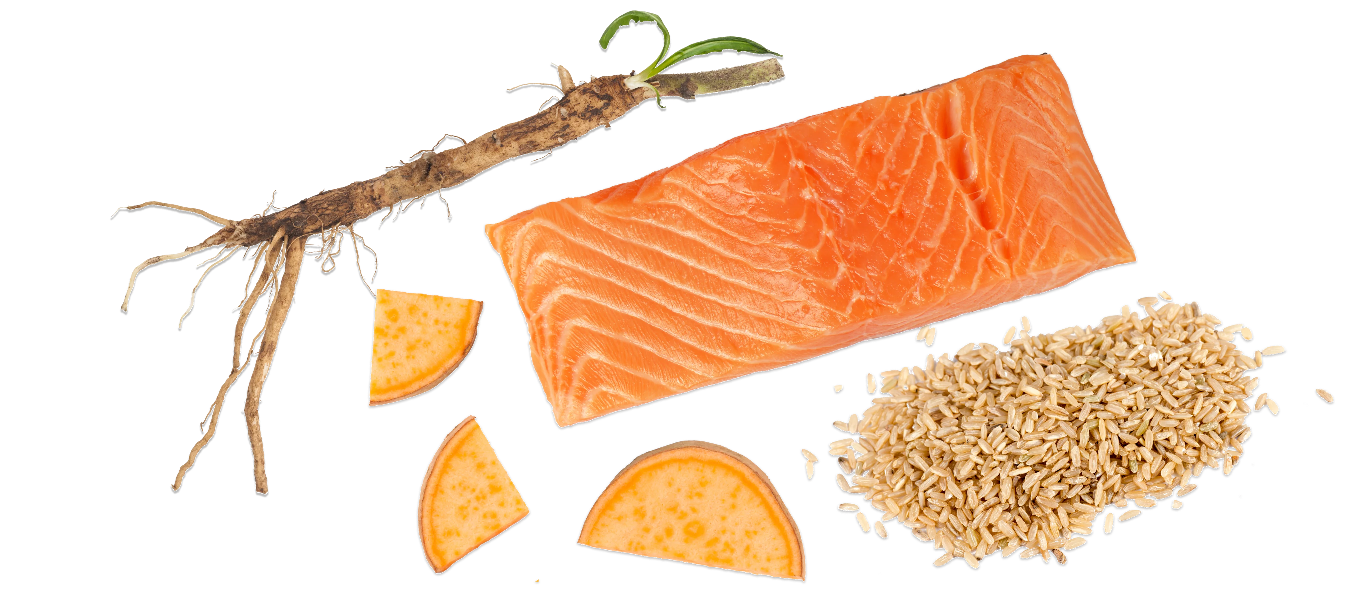 Fresh salmon (20%), dehydrated salmon (19%), dried sweet potatoes (12%), brown rice, white rice, canola oil, potato protein, vegetarian gravy, dried beet pulp, minerals, dried brewer’s yeast (1,5%), flax seed (1%), salmon oil (1%), dried chicory (0,5%, a natural source of FOS and inulin), dried carrots, cellulose, carob flour, yeast cell wall (0,2%, a natural source of MOS and beta glucans), psyllium husk (0,1%), dried spirulina (0,1%), dried herbs (Rosmarinus sp., Curcuma sp., Eugenia sp.)