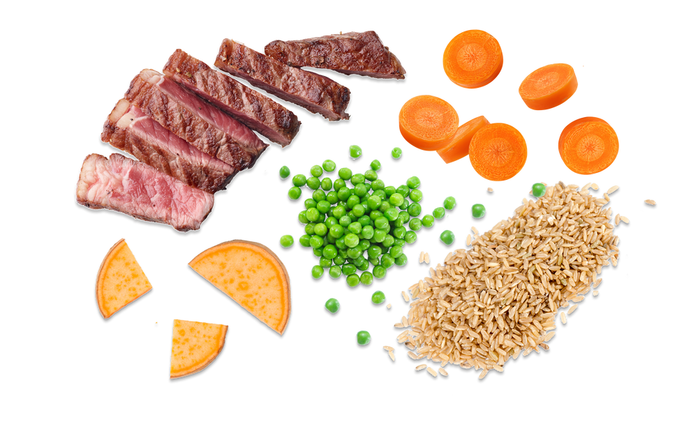 BEEF (36%), RICE (25%), WATER (17.7%), PEAS (7%), CARROTS (6.5%), SWEET POTATO, (6.5%), YEAST EXTRACT (1%), DRIED SPINACH (0.3%).